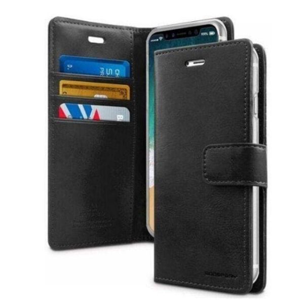 GOOSPERY Blue Moon Diary Wallet Case with Card Slots for Apple iPhone 14 Black. The cover is made of high-quality synthetic leather, it has 3 card slots and at the same time, it has another larger compartment that is perfect for storing bills or cash. It adapts perfectly to your smartphone providing unobstructed access to all its functions and keeps your mobile protected with the silicone case with the magnetic closure.