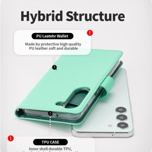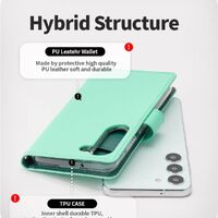 The Goospery Rich Diary Case for the Samsung Galaxy S23 in Mint offers a blend of style and functionality. Made from premium synthetic leather, it provides full protection against scratches and drops. The case features a magnetic clasp for secure closure and card slots for added convenience, making it perfect for carrying essential cards and cash. The precise cutouts ensure easy access to all ports and buttons. Its slim design maintains the phone's sleek profile while adding a touch of elegance with its mint color. Overall, this case combines practicality with a sophisticated aesthetic.