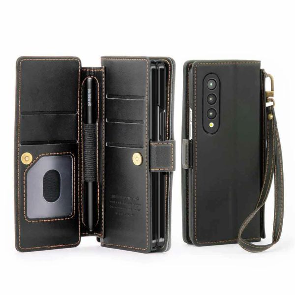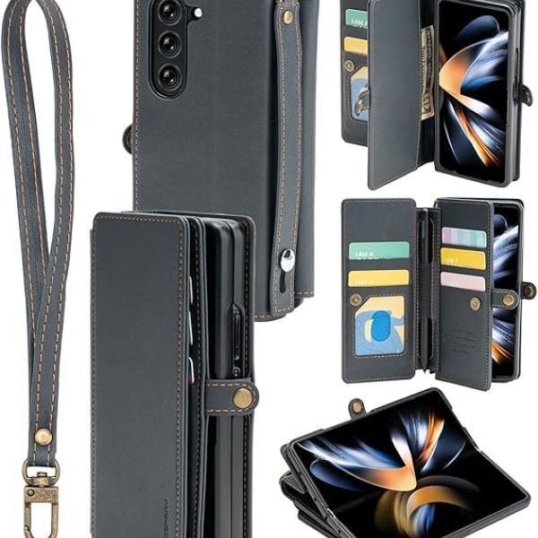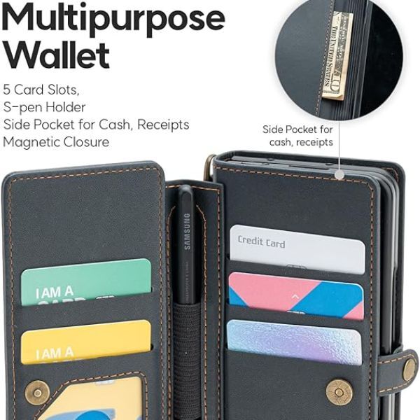 The Z Fold 5 Wallet case crafted with a detachable hand strap and finger grip strap, which not only provides a better grabbing experience but also provides additional protection when the phone accidentally drops. It also allows you to hold your phone firmly in your hand while also keeping it secure. Multifunctional clutch pouch+phone case in one. Designed with 5 card slots, 1 cash slot, and an S Pen Holder, it will carry your S Pen. It is made of premium material with a pocket-friendly design to provide a nice grip and make it easy to hold your phone. The slim and ergonomic design of Goospery Galaxy Z Fold 5 case offers the ultimate comfortable feeling in-hand. Supports wireless charging and powershare without removing the case. It also has a built-in kickstand and a landscape mode, which is convenient for watching movies or chatting videos, etc. Precise cutouts allow easy access to all ports, speakers and cameras. designed in detail for effortless use of the screen comfortably without interference.