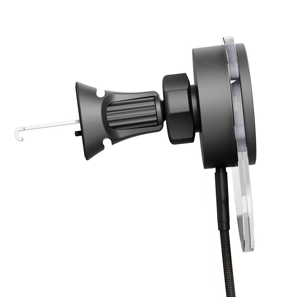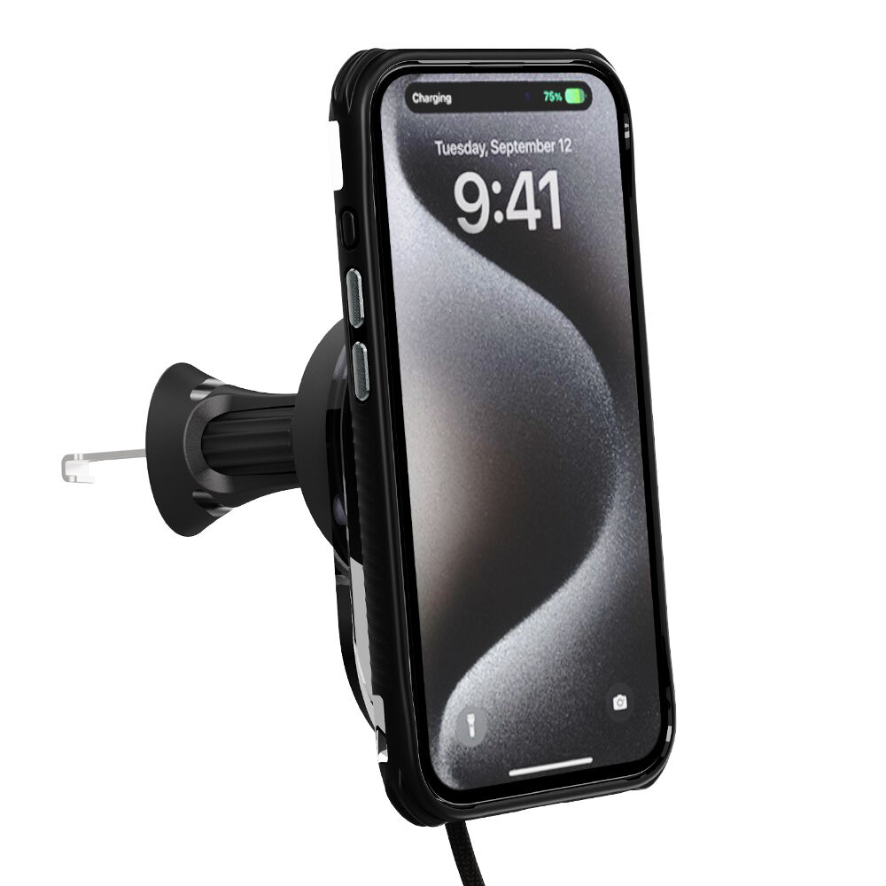 With the EFM Qi2 Wireless Car Charger, you get a safe, high-performance, and convenient charging solution for your car that combines reliability and flexibility. As a Qi2-certified product, it is the gold standard for wireless charging, offering up to 15W output and magnetic alignment compatible with MagSafe. This makes it perfect for iPhone 12 or newer, and any other Qi2 devices, ensuring fast and efficient charging. Its vent-mount friendly design with an adjustable securing hook provides a stable and reliable mount, keeping the charger secure even on bumpy roads. With 360-degree articulation, you can easily switch between portrait and landscape orientations for the best viewing angles. This package includes a 20W power supply and a 1-meter braided USB-C cable, providing everything you need to start charging right away.